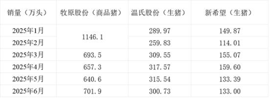 6月,牧原股份销售商品猪701.9万头,环比增长9.6%,同比增长58.35%。温氏股份销售生猪300.73万头(其中毛猪和鲜品270.39万头,仔猪30.34万头),环比下降4.69%,同比增长28.93%。新希望销售生猪133万头,环比下降0.29%,同比增长3.38%。
