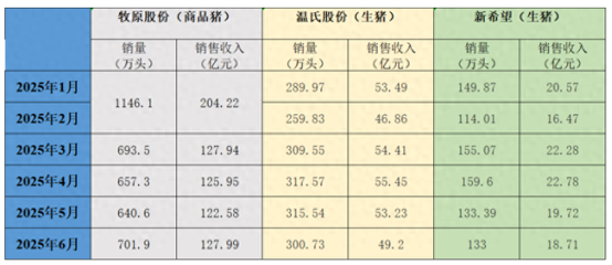 6月,牧原股份商品猪销售收入127.99亿元,环比增长4.4%,同比增长27.65%。温氏股份生猪销售收入49.20亿元,环比下降7.57%,同比下降5.4%。新希望销售生猪收入18.71亿元,环比下降5.12%,同比下降19.14%。